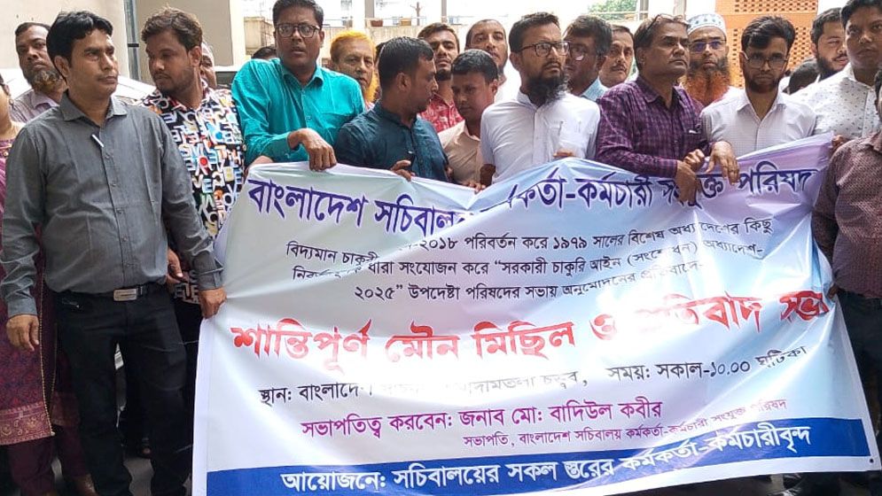 ‘সরকারি চাকরি (সংশোধন) অধ্যাদেশ, ২০২৫’-এর খসড়া অনুমোদনের প্রতিবাদে সচিবালয়ের ভেতরে অবস্থান কর্মসূচি ও প্রতিবাদ সভা করেছে বাংলাদেশ সচিবালয় কর্মকর্তা-কর্মচারী সংযুক্ত
