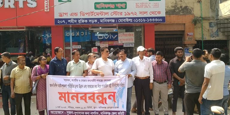 মানিকগঞ্জে আইনশৃঙ্খলা উন্নয়ন ও গণতন্ত্র পুনঃপ্রতিষ্ঠার দাবিতে সুজনের মানববন্ধন