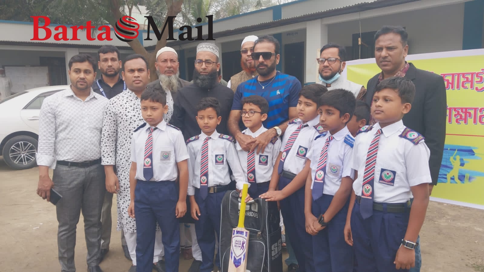 ক্রিকেট সামগ্রী নিয়ে খুদে শিক্ষার্থীদের পাশে ক্রিকেটার জাভেদ ওমর বেলিম ও মিজান